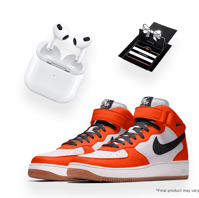 And as a thank you for pre-booking, choose either a pair of Apple Airpods Pro, a pair of Nike By You sneakers, or a Sephora gift card.